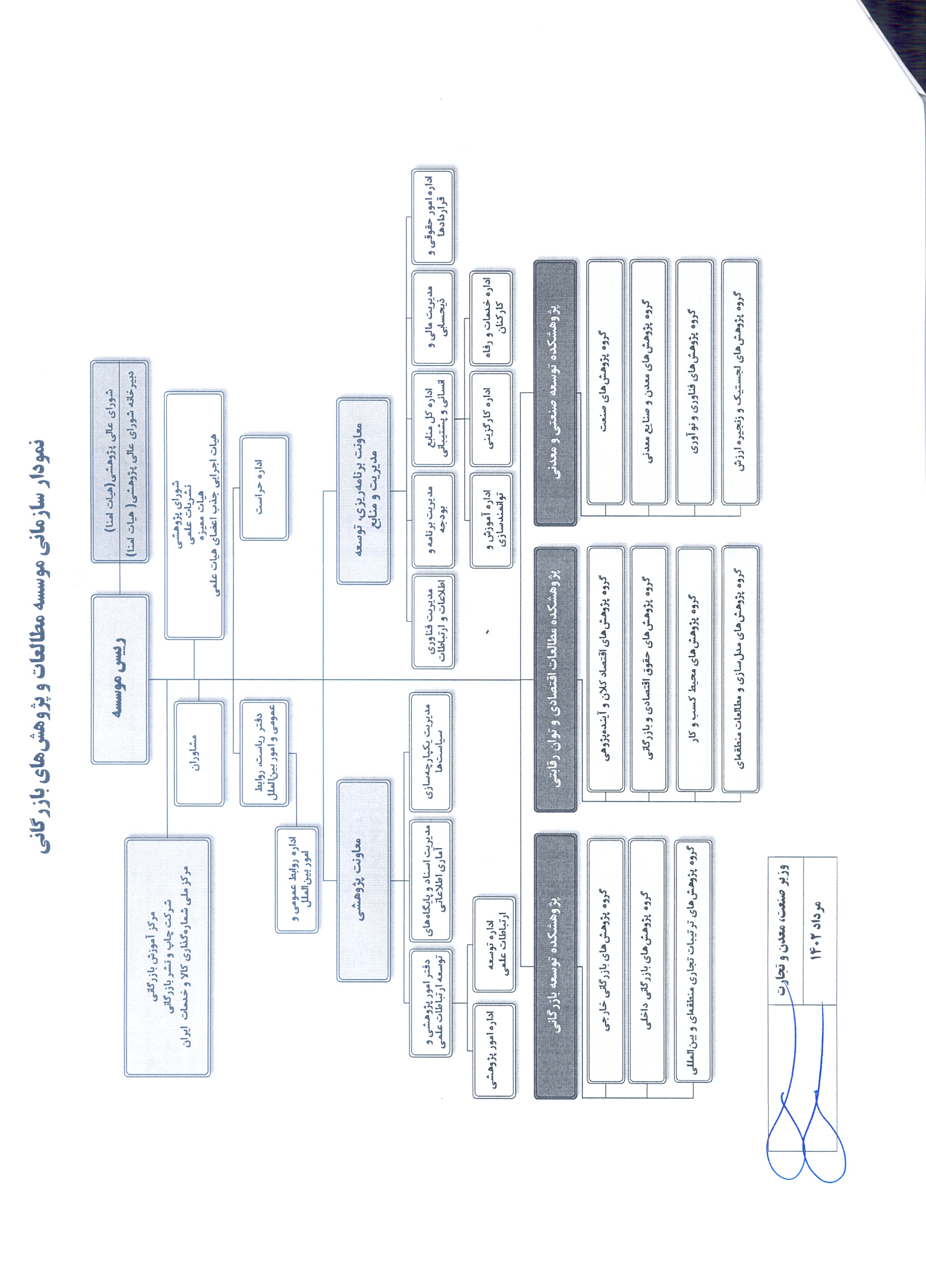 موسسه مطالعات و پژوهشهای بازرگانی از دو معاونت پژوهشی و معاونت برنامهریزی، توسعه مدیریت و منابع و 3 پژوهشكده، 11 گروه پژوهشی و مراكز تابعه شامل مركز آموزش بازرگانی با بیش از 35 نمایندگی آموزشی در سراسر كشور، شركت چاپ و نشر بازرگانی و مركز ملی شماره گذاری كالا و خدمات ایران تشكیل شده است.