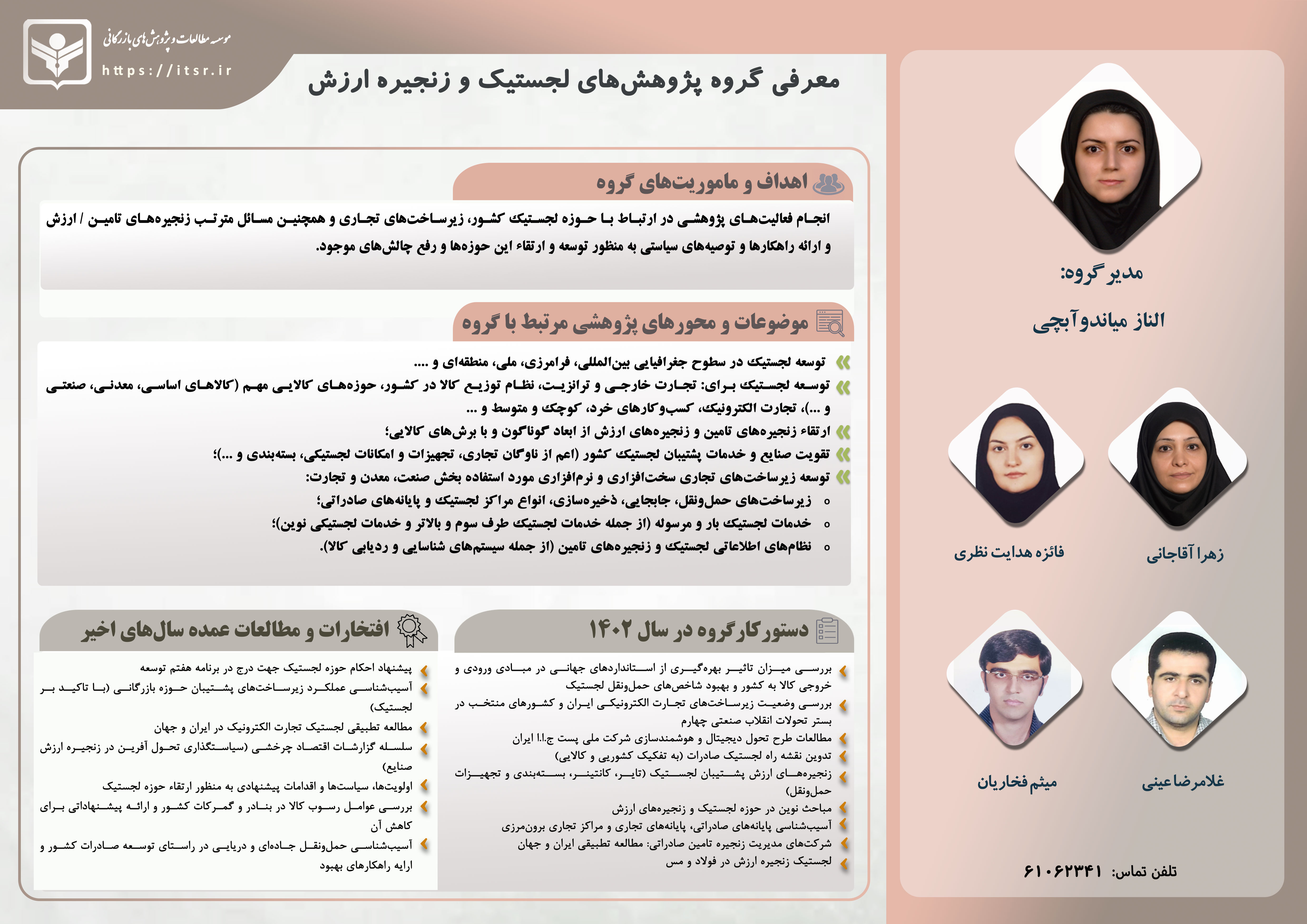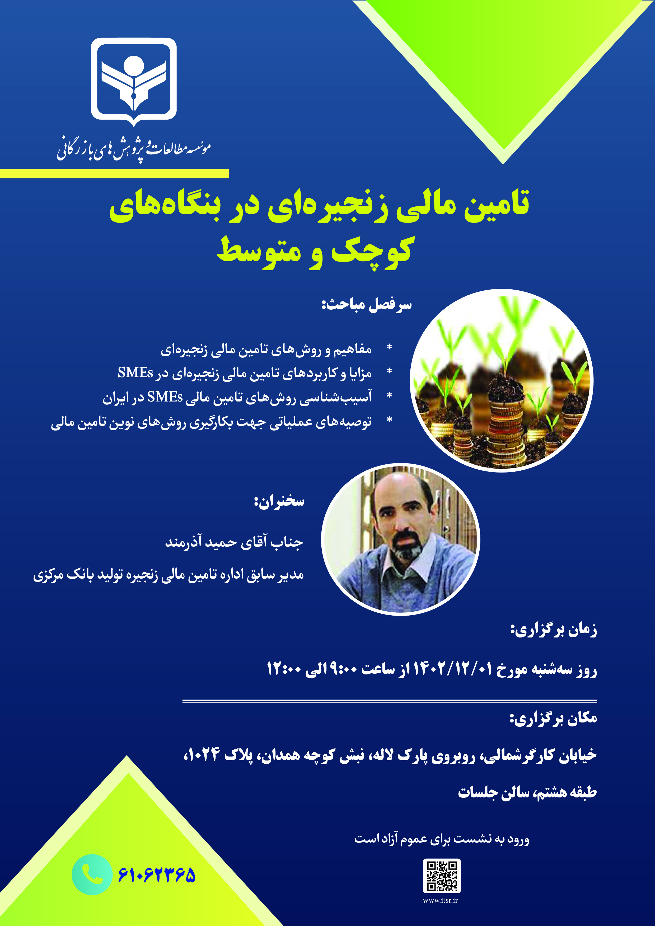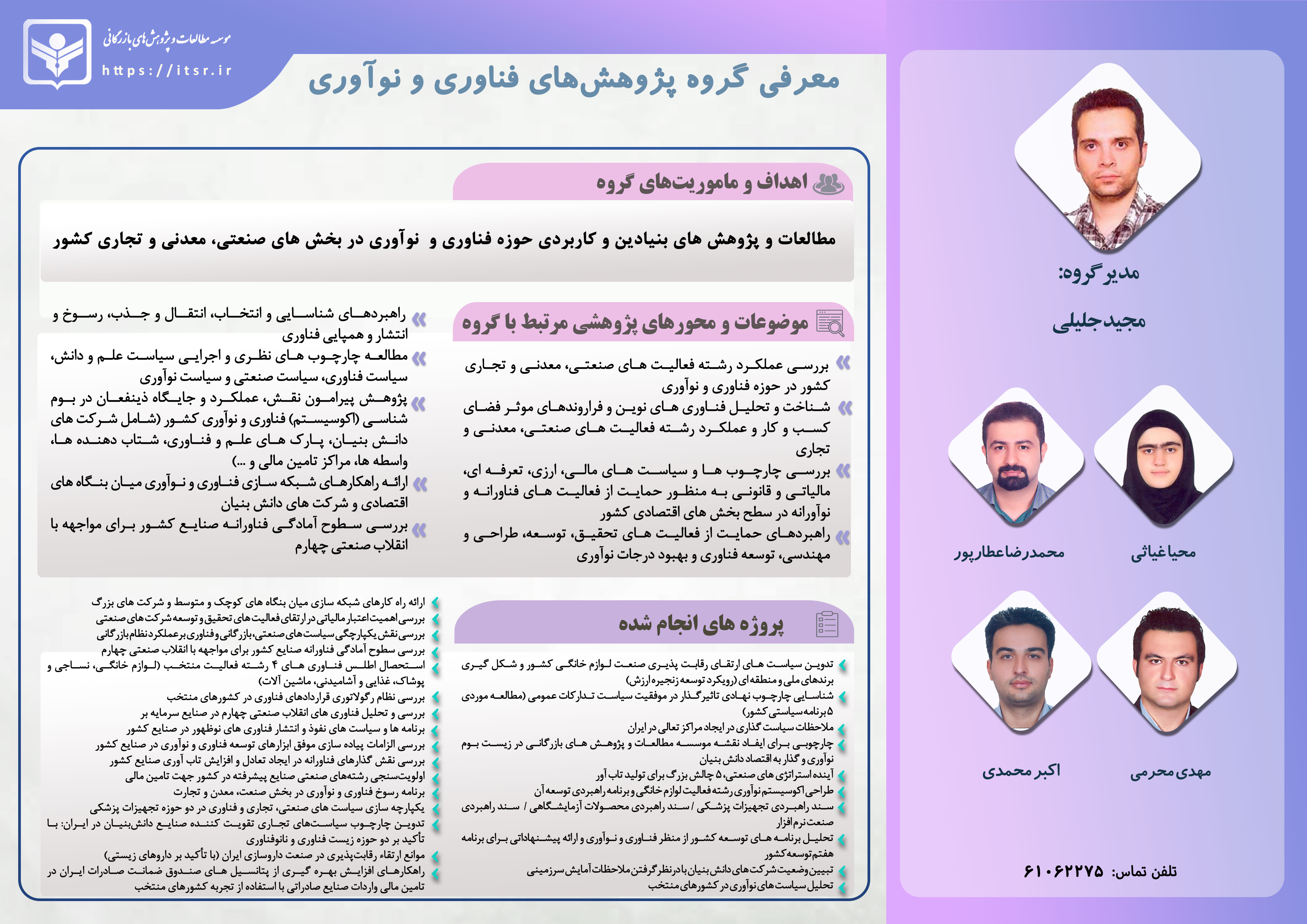 اخبار . 1404/03/21مؤسسه مطالعات و پژوهشهای بازرگانی در نظر دارد در سال جاری از تعدادی پایاننامه با محوریت موضوعات پیوست و همچنین موضوعات پیشنهادی اعضای هیئت علمی حمایت مادی و معنوی به عمل آورد.از دانشجویان و اعضای هیئت علمی محترم تقاضا میشود جهت کسب اطلاعات بیشتر و دریافت جزئیات لازم، با دفتر ارتباطات علمی به شمارههای ۶۱۰۶۲۴۶۵ و ۶۱۰۶۲۲۲۳ تماس حاصل فرمایند.... ادامه » -