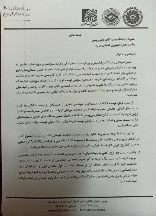 در این نامه با تقدیر از رویکرد مثبت دولت سیزدهم در حوزه تجارت خارجی به ویژه توسعه صادرات غیرنفتی در دوره یکساله، آمده است: این روند نتایج و دستاوردهای درخشانی برای اقتصاد کشور به همراه داشته است، از زمان آغاز به کار رسمی مدیریت جدید در معاونت دیپلماسی اقتصادی وزارت امور خارجه و همچنین سازمان توسعه تجارت در دولت سیزدهم، رویکرد تعاملی این دستگاهها برخلاف شدیدترین تحریمهای اقتصادی کشور موجب تقویت روحیه و امید میان صادرکنندگان شده و منجر به رشد صادرات کالاهای ایرانی به بازارهای جهانی و به خصوص کشورهای همسایه شده است.