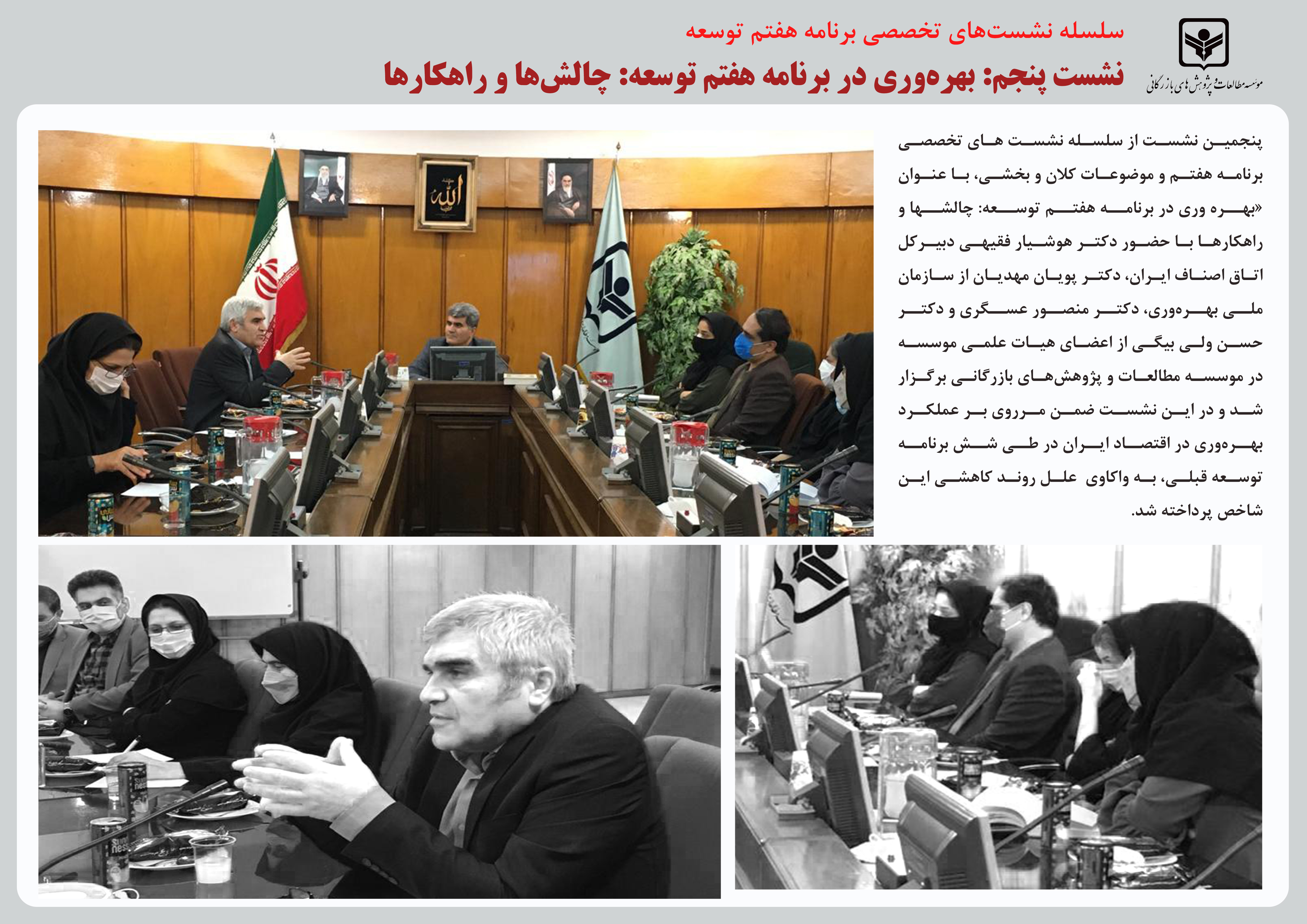 پنجمین نشست از سلسله نشست های تخصصی برنامه هفتم و موضوعات کلان و بخشی، با عنوان «بهره وری در برنامه هفتم توسعه: چالشها و راهکارها با حضور دکتر هوشیار فقیهی دبیرکل اتاق اصناف ایران، دکتر پویان مهدیان از سازمان ملی بهرهوری، دکتر منصور عسگری و دکتر حسن ولی بیگی از اعضای هیات علمی موسسه در موسسه مطالعات و پژوهش های بازرگانی برگزار شد و در این نشست ضمن مرروی بر عملکرد بهرهوری در اقتصاد ایران در طی شش برنامه توسعه قبلی، به واکاوی علل روند کاهشی این شاخص پرداخته شد.