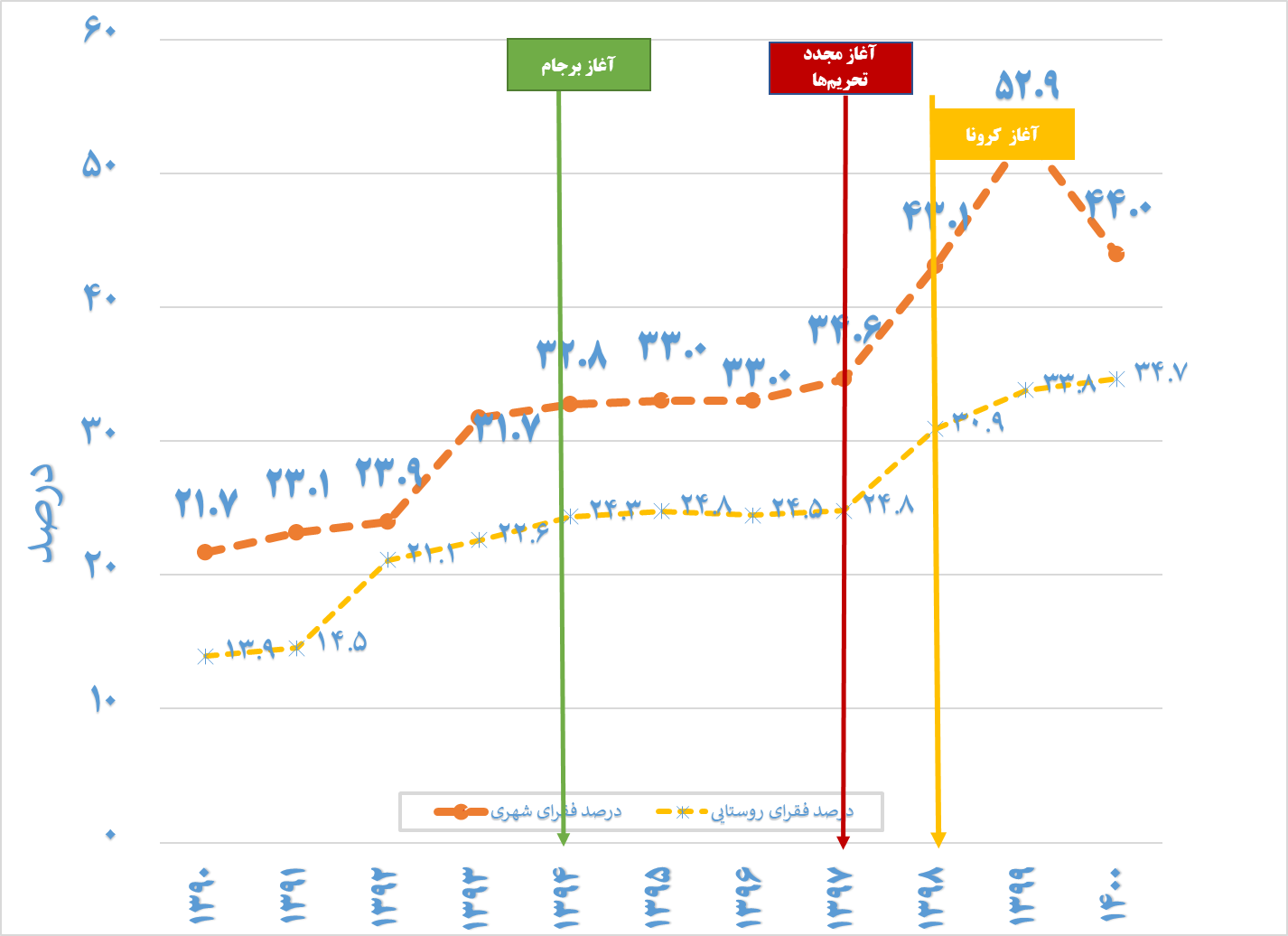 نمودار (2). درصد فقرای خانوارهای شهری و روستایی 1391 تا 1400