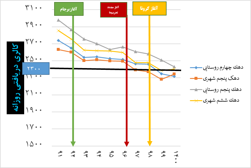نمودار (1). کالری دریافتی خانوارهای شهری و روستایی 1391 تا 1400