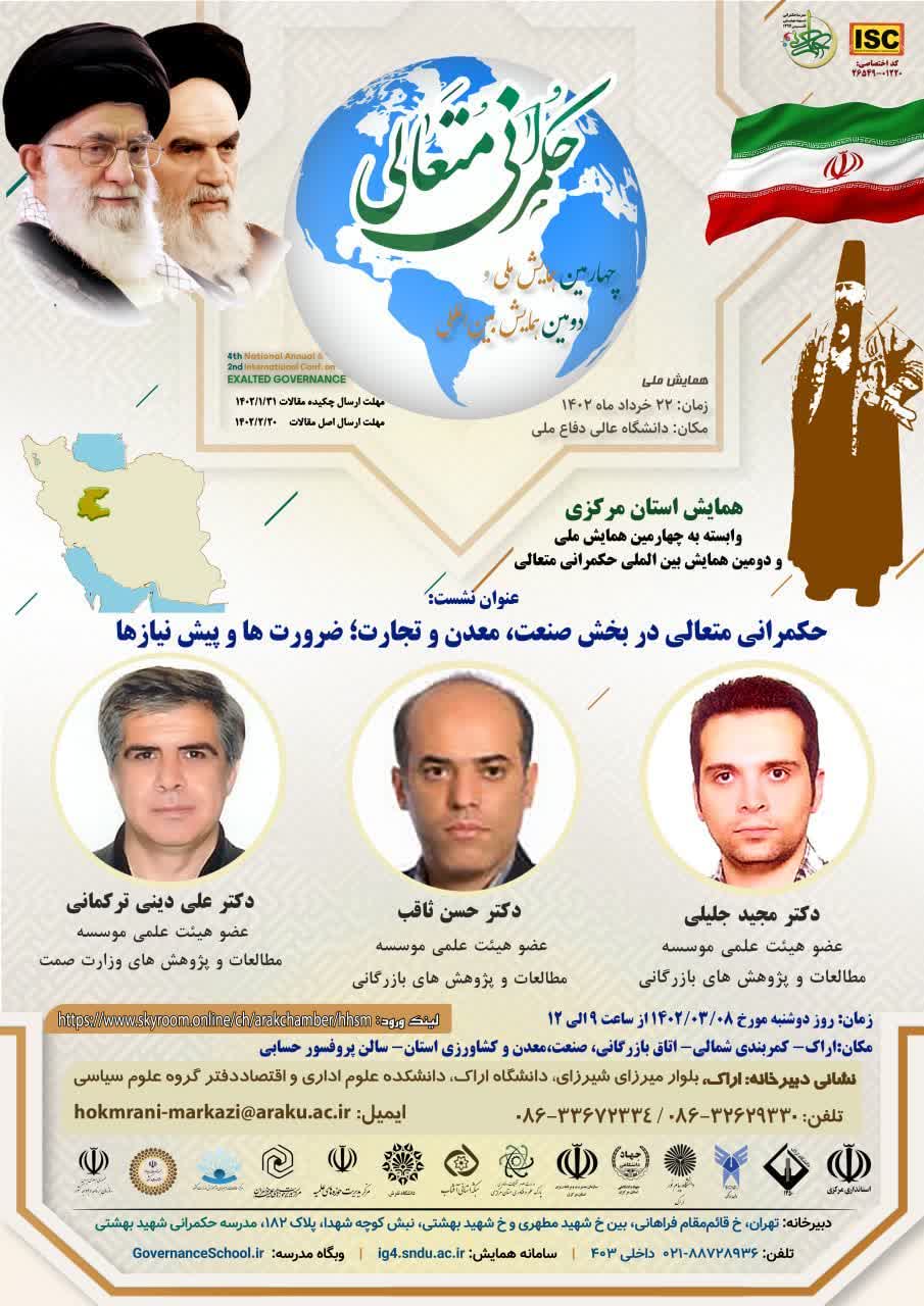 نشست "حکمرانی متعالی در بخش صنعت، معدن و تجارت؛ ضرورت ها و پیش نیازها" با حضور مجید جلیلی، حسن ثاقب و علی دینی اعضای هیات علمی موسسه مطالعات و پژوهش های بازرگانی با همکاری سازمان صنعت، معدن و تجارت استان مرکزی و دفتر امور پژوهشی و توسعه ارتباطات موسسه، در محل اتاق بازرگانی، صنعت، معدن و تجارت استان مرکزی برگزار شد.