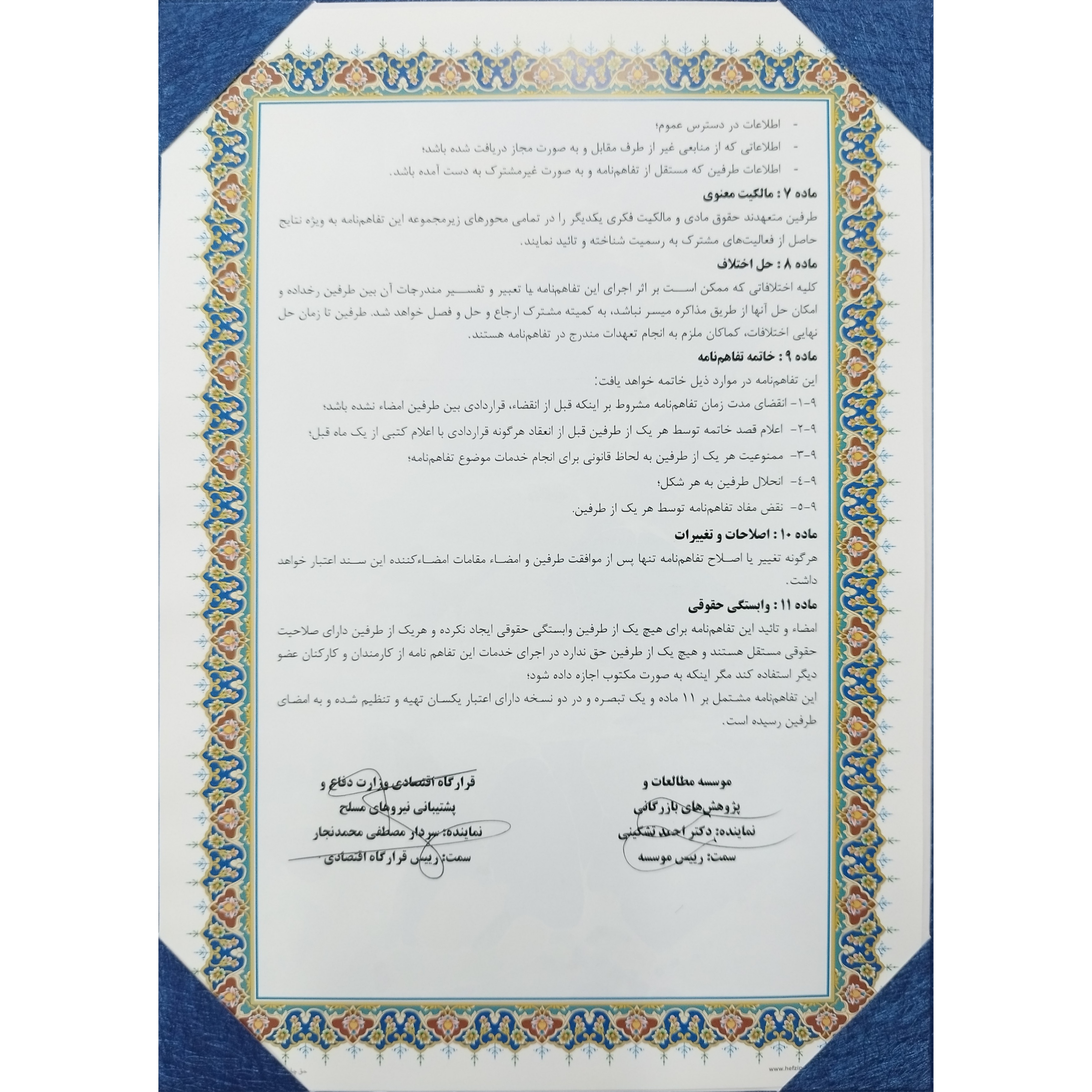 گفتنی است، در راستای تحقق منویات مقام معظم رهبری (مدظلهالعالی) در سال رشد تولید و به منظور ایجاد و گسترش همكاریهای حوزههای تحقیقات کاربردی و فناورانه در راستای شناسایی، بههمرسانی و حل مسائل مرتبط با هدف توسعه همكاریها و تعاملات در جهت شناسایی، تدوین و بهروزرسانی دکترین و راهبردهای حوزه اقتصادی در بخشهای نفت و گاز، صنعت، معدن و تجارت با رویكرد بهکارگیری و ایجاد ظرفیتها در سطح ملی و فراملی، تفاهمنامه ای بین دکتر احمد تشکینی رییس «موسسه مطالعات و پژوهشهای بازرگانی» و سردار مصطفی محمدنجار رییس«قرارگاه اقتصادی وزارت دفاع و پشتیبانی نیروهای مسلح» منعقد شد.