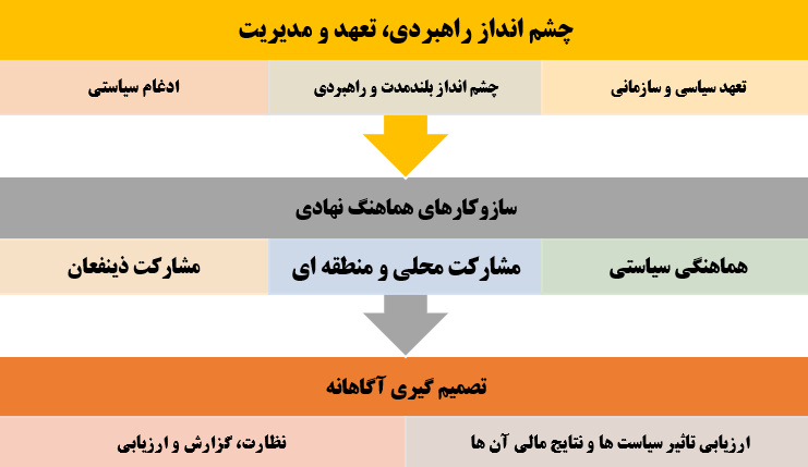 - سازوکارهای هماهنگ نهادی[13]: سازوکارهای هماهنگی نهادی و یا به عبارت ساده تر اقدامات هماهنگ در سطوح و بخش های دولت، به عنوان رکن دوم انسجام سیاستی تعریف می شود، که دربرگیرنده حکمرانی فراگیر و تعاملات هماهنگ میان بخش های مختلف در سطح دولت برای رسیدن به اهداف سیاستی است. سازوکارهای هماهنگی نهادی متاثر از سه مقوله است. مقوله نخست به موضوع «هماهنگی سیاست ها»[14] اشاره دارد. در هماهنگی سیاست ها به هماهنگی دولت برای شناسایی و کاهش اختلاف میان اولویت ها و سیاست های بخشی از جمله سیاست های خارجی و داخلی و ترویج اقدامات متقابل میان بخش ها و نهادها برای همسوسازی سیاست ها اشاره دارد. ابزارهای این مقوله نیز ایجاد یک نهاد سیاستگذار اصلی و مادر برای هدایت سایر ارگان ها، شناسایی واگرایی ها و تضادهای سیاستی (در حوزه های سیاسی، اقتصادی، زیست محیطی و ...)، ایجاد شبکه ارتباطی موثر میان وزارتخانه ها و نهادها و ظرفیت سازی و آموزش بدنه دولت برای اقدامات هماهنگ در راستای سیاست های ابلاغی به شمار می روند. مقوله دوم به «مشارکت محلی و منطقه ای»[15] اشاره دارد. این مقوله به معنی ترویج هم افزایی و تراز اولویت ها میان سیاست های ملی، منطقه ای و محلی برای همسویی بهتر و کمک به اهداف اقتصادی، اجتماعی و زیست محیطی مرتبط، از جمله تعهدات بین المللی و ... است. مقوله سوم نیز «مشارکت ذینفعان»[16] است که به معنی تعامل فعالانه با ذینفعان در مراحل مختلف از چرخه سیاست و اجرا است که می تواند مواردی نظیر تبادل دانش و تخصص، اشتراک گذاری نگرانی ها و نیازمندی ها، اشتراک گذاری اطلاعات و ... را دربر بگیرد. اهمیت این موضوع در مواردی نظیر شناسایی اولویت ها، تنظیم اقدامات اجرایی و به کارگیری موثر منابع قابل بررسی است.