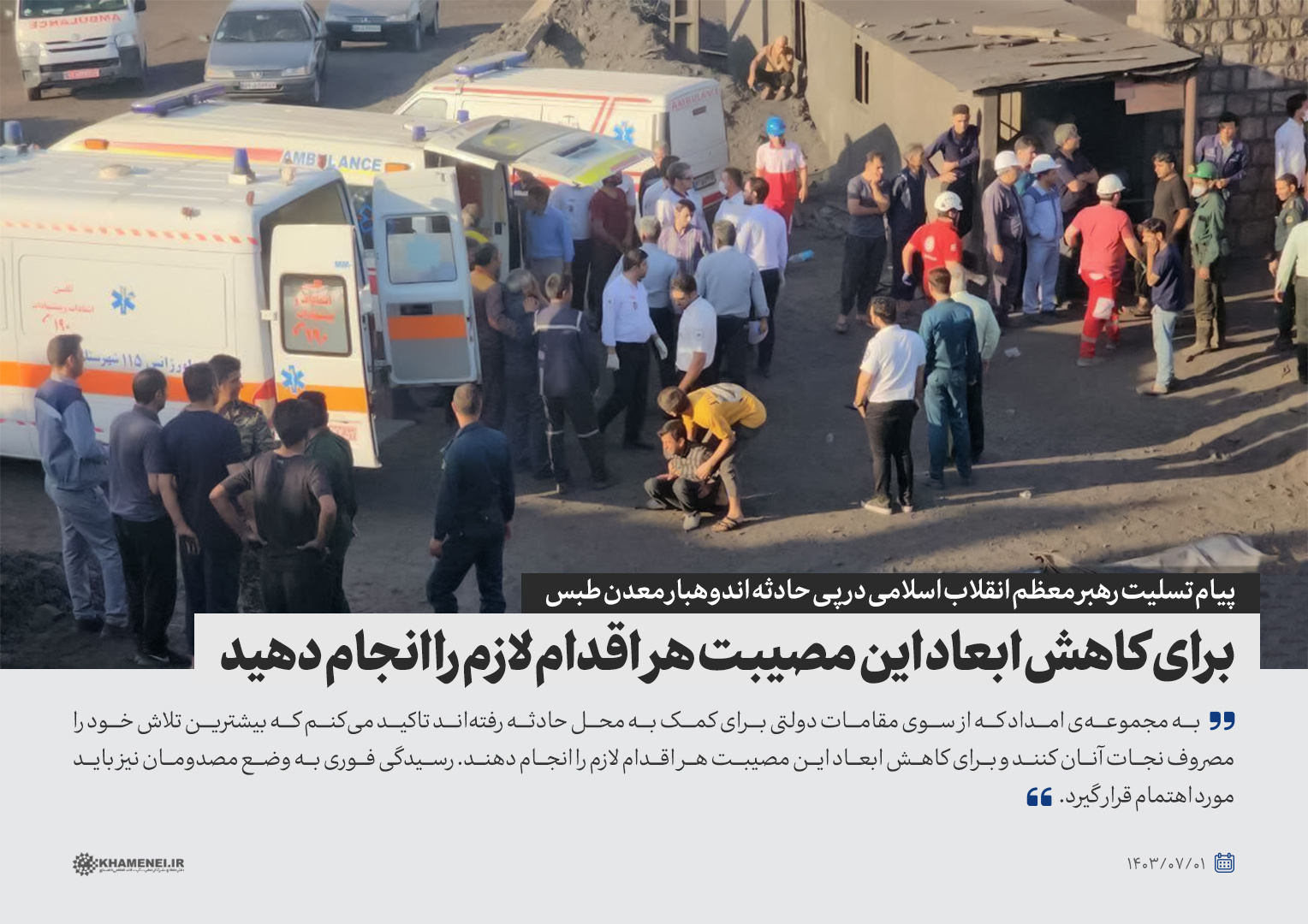 حادثهی تلخ و اندوهبار، در معدن ذغال سنگ در طبس را که در آن تعدادی از کارگران قربانی یا مصدوم شدند، به خانوادههای این عزیزان و مردم آن منطقه تسلیت عرض میکنم. به مجموعهی امداد که از سوی مقامات دولتی برای کمک به محل حادثه رفتهاند تاکید میکنم که بیشترین تلاش خود را مصروف نجات آنان کنند و برای کاهش ابعاد این مصیبت هر اقدام لازم را انجام دهند. رسیدگی فوری به وضع مصدومان نیز باید مورد اهتمام قرار گیرد.