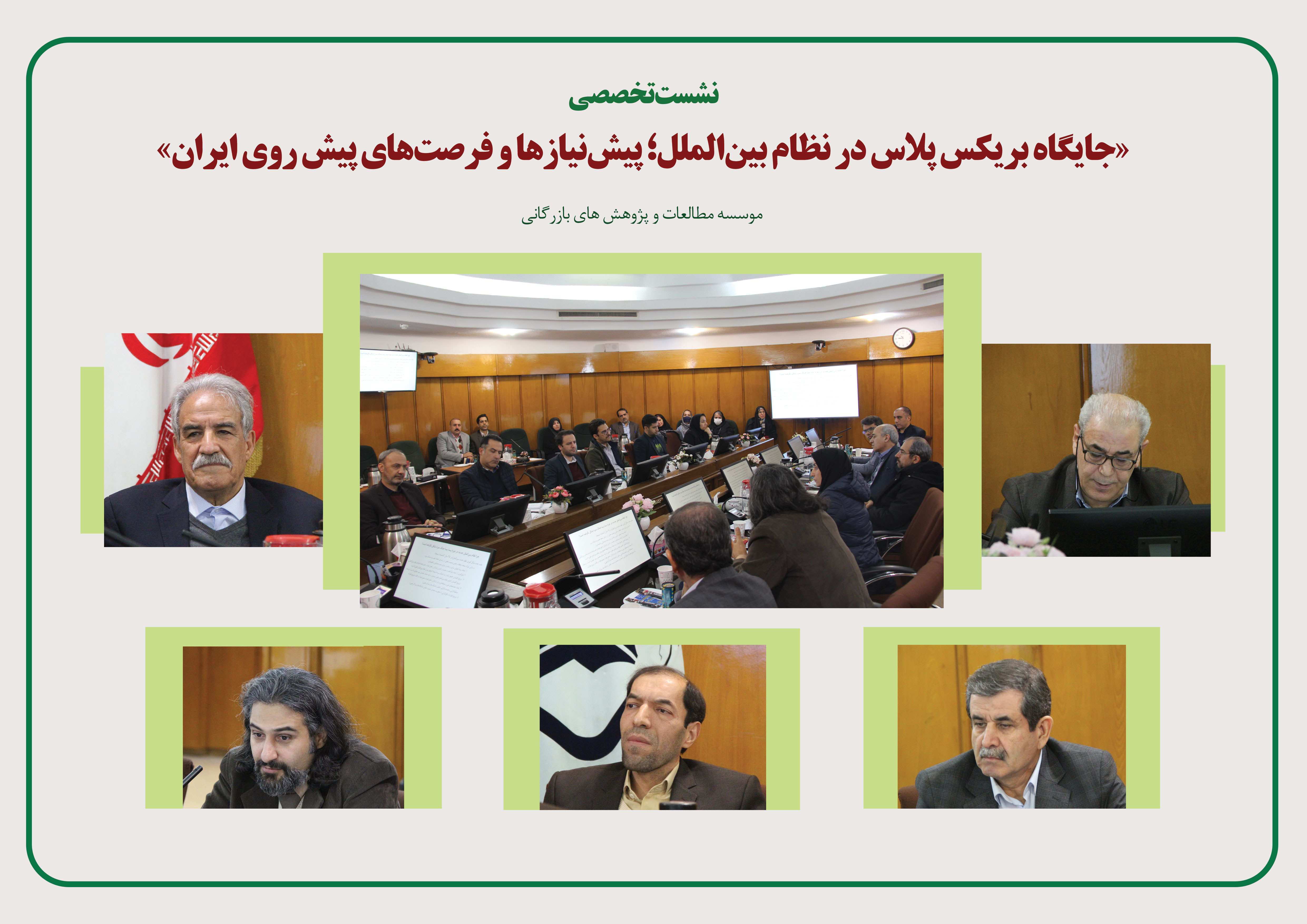 نشست تخصصی«جایگاه بریکس پلاس در نظام بینالملل: پیشنیازها و فرصتهای پیش روی ایران» با حضور دکتر حسین نوروزی، عضو هیات علمی دانشگاه تهران، دکتر سجاد صادقی، فارغ التحصیل مقطع دکتری روابط بینالملل دانشگاه علامه طباطبایی، دکتر بهرام امیراحمدیان، استاد مدعو دانشگاه علامه طباطبایی، میرهادی سیدی، مشاور امور بین الملل و توافق های تجاری سازمان توسعه تجارت ایران و دکتر میرعبداله حسینی عضو هیات علمی موسسه و دبیر نشست در موسسه مطالعات و پژوهش های بازرگانی برگزار شد.