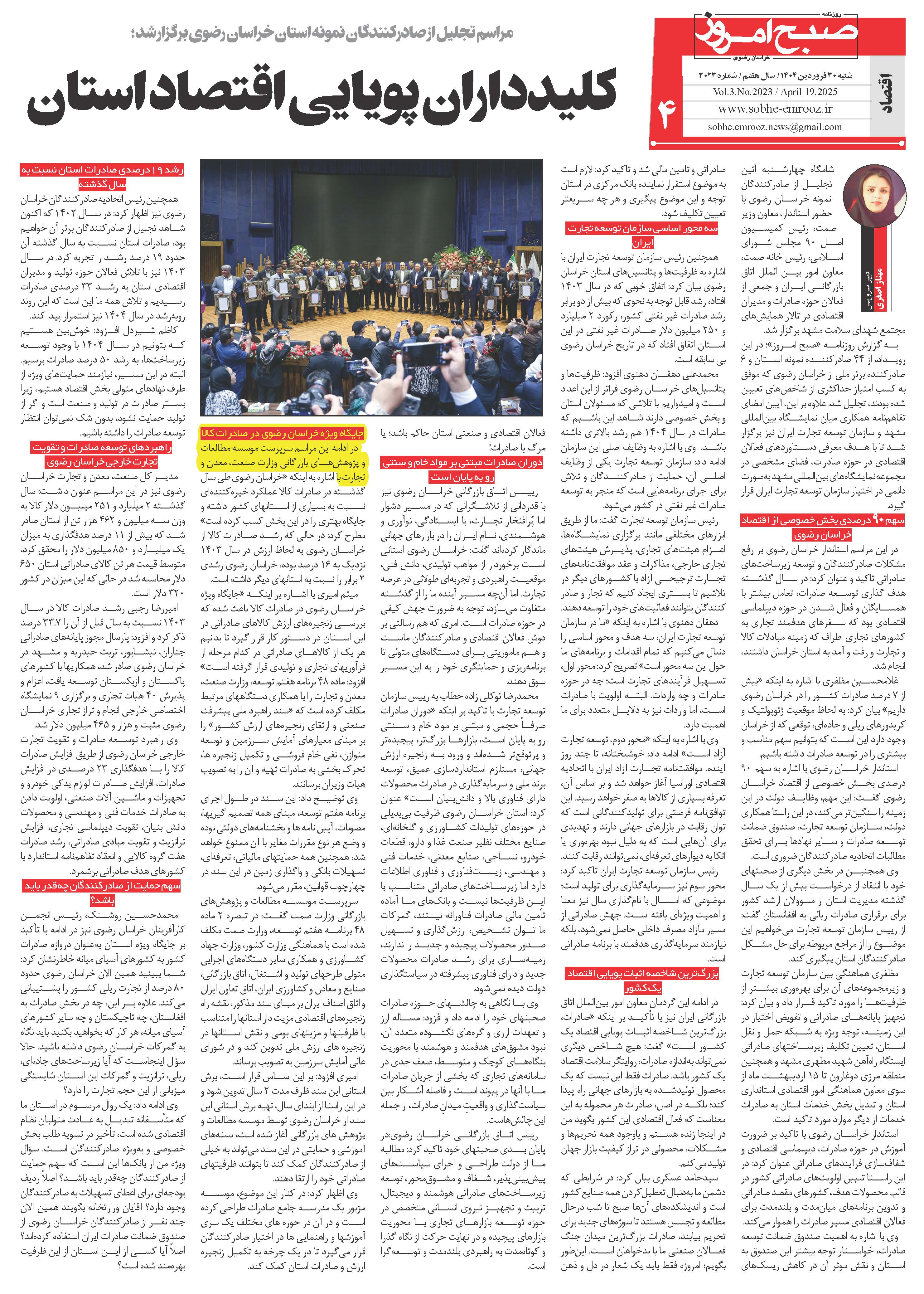 چاپ سخنرانی رییس موسسه مطالعات و پژوهش های بازرگانی در روزنامه صبح امروز: جایگاه ویژه خراسان رضوی در صادرات کالا