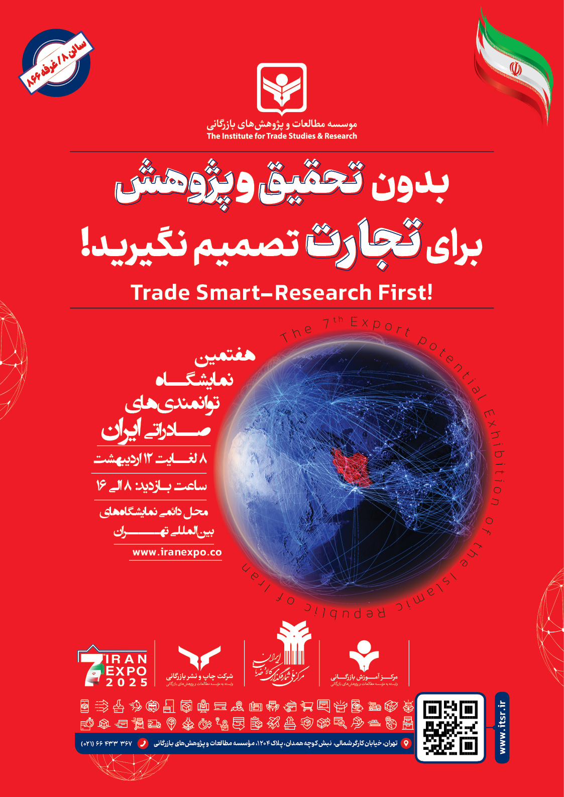 موسسه مطالعات و پژوهش های بازرگانی و مراکز تابعه در هفتمین نمایشگاه توانمندی های صادراتی جمهوری اسلامی ایران (ایران اکسپو 2025) که از 8 تا 12 اردیبهشت 1404 در محل دائمی نمایشگاه بین المللی تهران برگزار می شود، حضور خواهند یافت.