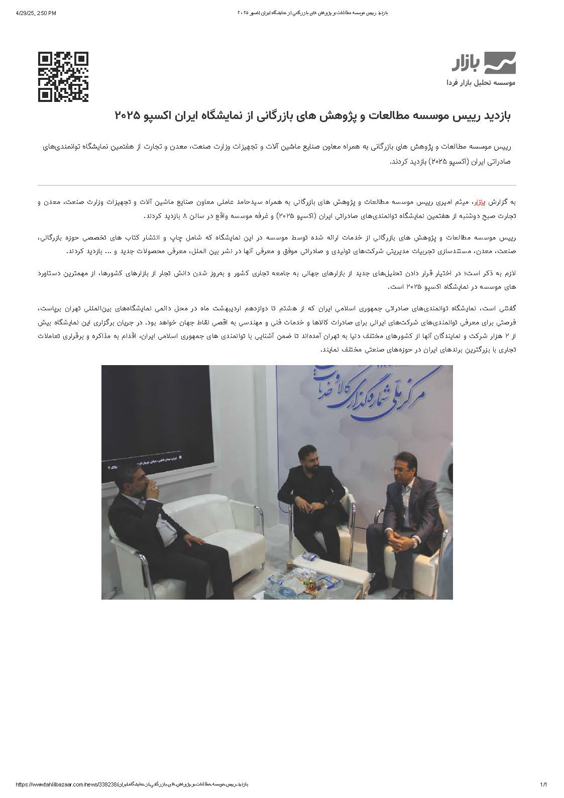 چاپ خبر بازدید رییس موسسه مطالعات و پژوهش های بازرگانی از نمایشگاه ایران اکسپو 2025 در خبرگزاری بازار