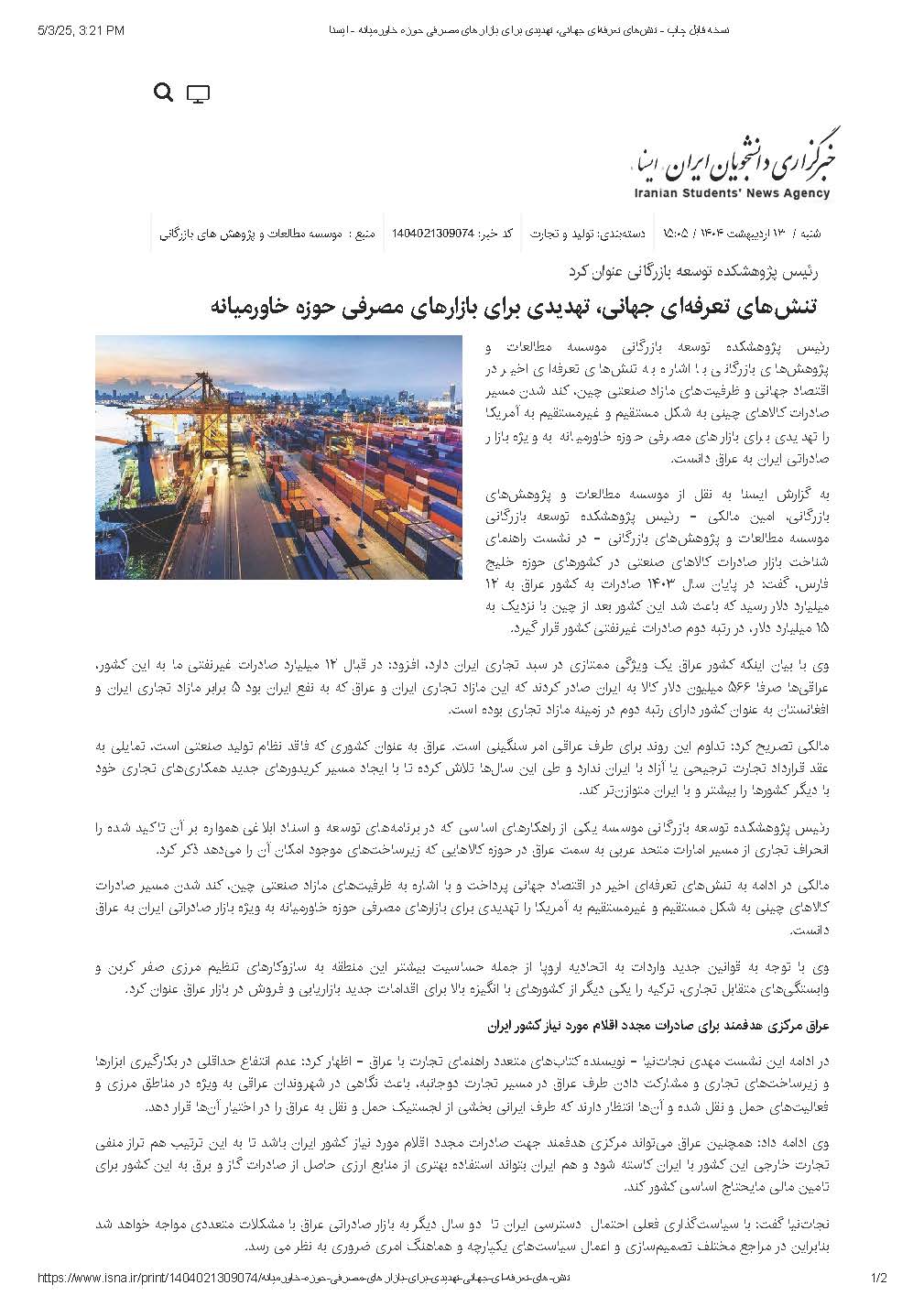 چاپ خبر نشست راهنمای شناخت بازار صادرات کالاهای صنعتی در کشورهای حوزه خلیج فارس در خبرگزاری ایسنا: تنشهای تعرفهای در اقتصاد جهانی تهدیدی برای بازارهای مصرفی حوزه خاورمیانه