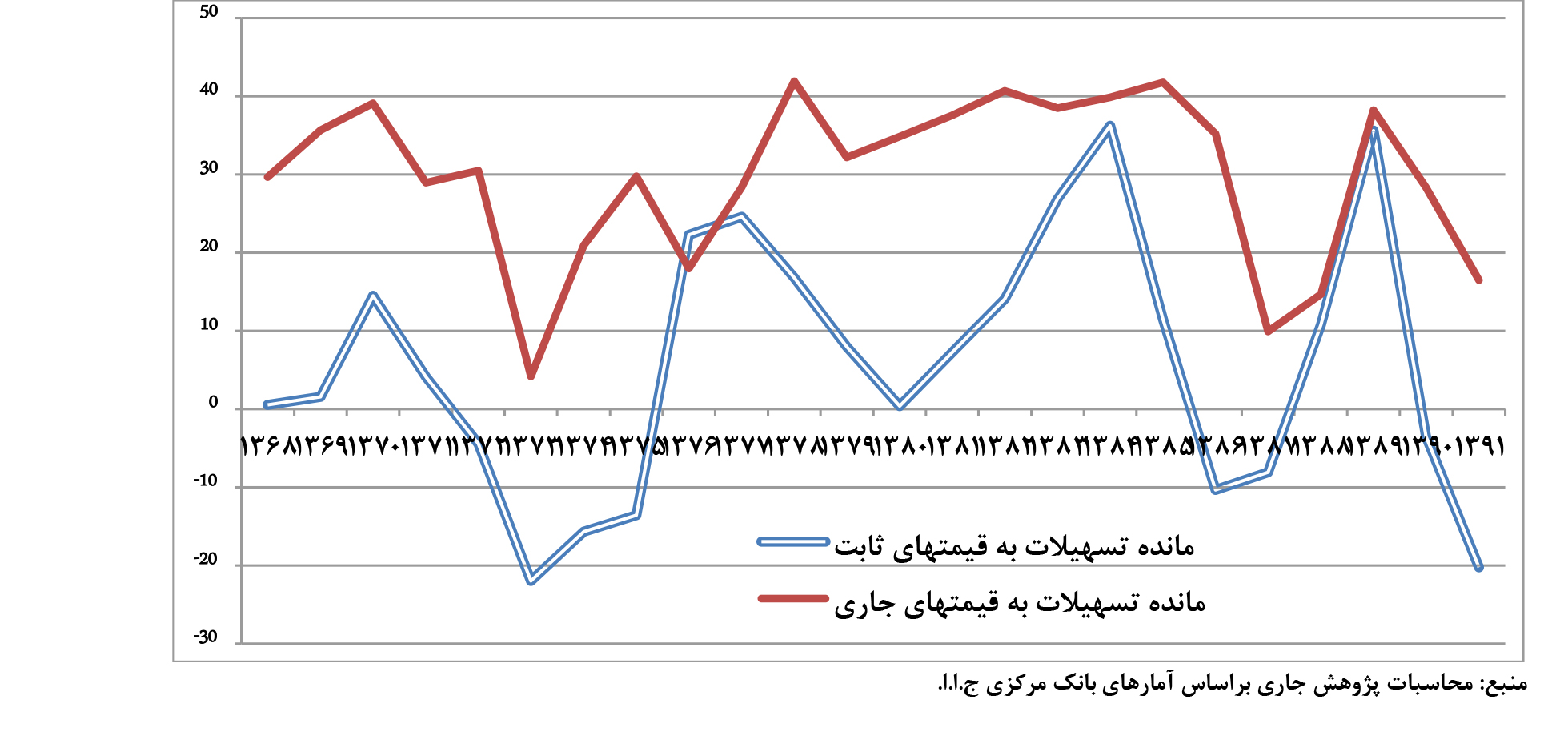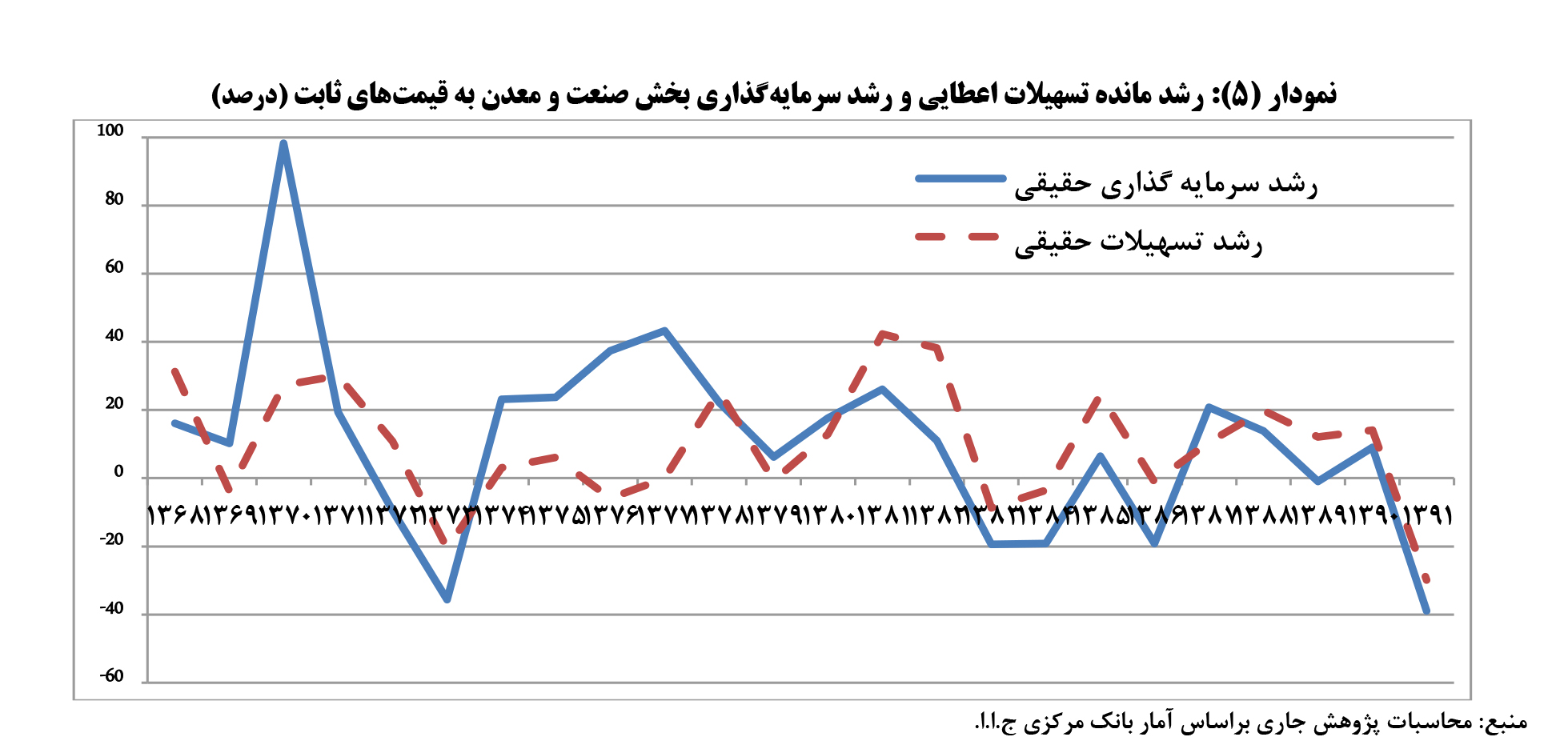 متوسط رشد مانده تسهیلات به قیمت جاری طی دوره 91-1368 معادل 29.8 درصد بوده است ولی متوسط رشد حقیقی آن 5.7 درصد بوده است که این امر ناشی از اثرات منفی تورم های دورقمی و بالای اقتصاد ایران بر قدرت خرید تسهیلات اعطایی است. گفتنی است با وجود رشد بيش از 10 درصدي تسهيلات حقيقي پرداختي به بخش صنعت و معدن در برنامه چهارم توسعه، سرمايهگذاري اين بخش رشد پایینی داشته است که می تواند ناشی از عوامل متعددی مانند تاثیرات بروز بيماري هلندي در اقتصاد ایران، افزایش قیمت نسبی محصولات غیرمبادله و به تبع آن کاهش رشد سرمایه گذاری بخش های مولد باشد. براساس نمودار (3) مشاهده می شود که علیرغم رشدهای بالای مانده تسهیلات اعطایی به قیمت جاری طی دوره 91-1368، ولی رشدهای حقیقی تسهیلات اعطایی در برخی سال ها حتی منفی بوده است. گفتنی است دوره 85-1376 تنها دوره ای است که به طور مستمر رشد حقیقی تسهیلات مثبت بوده است.
