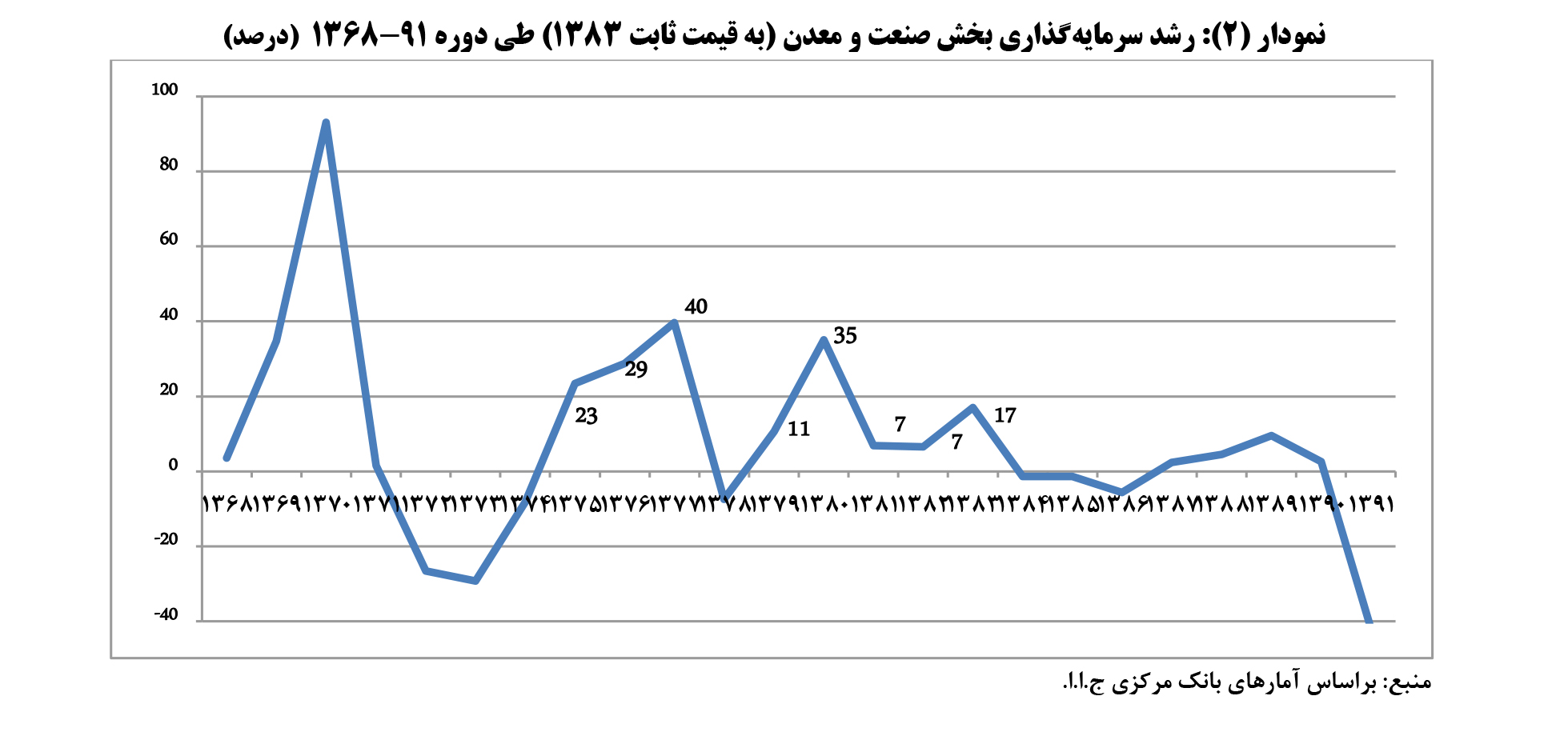 متوسط رشد تشکیل سرمایه ثابت ناخالص صنعت و معدن به قیمت های جاری و ثابت 1383 طی دوره 91-1368 به ترتیب 29.3 و 5.3 درصد بوده است. تفاضل ارقام مذکور (24 درصد) نشانگر افزایش نیاز به منابع مالی جهت تامین سرمایه گذاری موردنیاز ناشی از تورم می باشد. به بیان دیگر تورم های دورقمی و بالا منجر به افزایش نیاز به منابع مالی جهت تامین سرمایه موردنیاز می شود. گفتنی است دوره 83-1375 (به جز سال 1378) با ثبات ترین دوره از منظر تجربه رشدهای مثبت سرمایه گذاری بخش صنعت و معدن می باشد. طي برنامه چهارم و پنجم توسعه به دلایلی مانند اتخاذ سياست ارزي نامناسب، افزايش واردات و ... رشد سرمايهگذاري در بخش صنعت و معدن كاهش يافته است (نمودار 2).