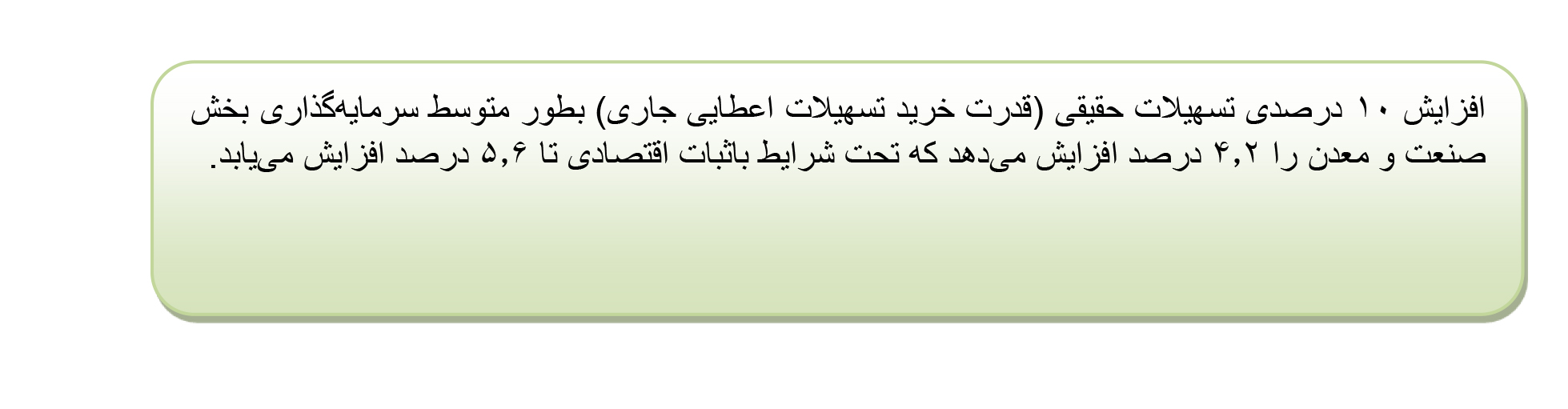 تقاضاي اعتبارات در این بخش ارتباط مستقيمي با سطح فعاليتهاي اقتصادي دارد. لذا براي افزايش فعاليتهاي اقتصادي و تحقق رشد اقتصادي، افزايش ميزان تسهيلات بانكي اقدامي ضروري است. افزایش تسهیلات حقیقی تاثیر مثبت و معناداری بر سرمایه گذاری بخش صنعت و معدن دارد؛ بگونه ایکه افزایش 10 درصدی آن منجر به افزایش 4.2 درصدی سرمایه گذاری این بخش خواهد شد. گفتنی است تحت شرایط باثبات اقتصادی تاثیر تسهیلات حقیقی بر سرمایه گذاری به 5.6 درصد افزایش می یابد. این امر بدان مفهوم است که برای بخشهای تولیدی اقتصاد ایران بویژه بخش صنعت و معدن «میزان تسهیلات بانکی» اهمیتی ویژه در افزایش سرمایه گذاری دارد.