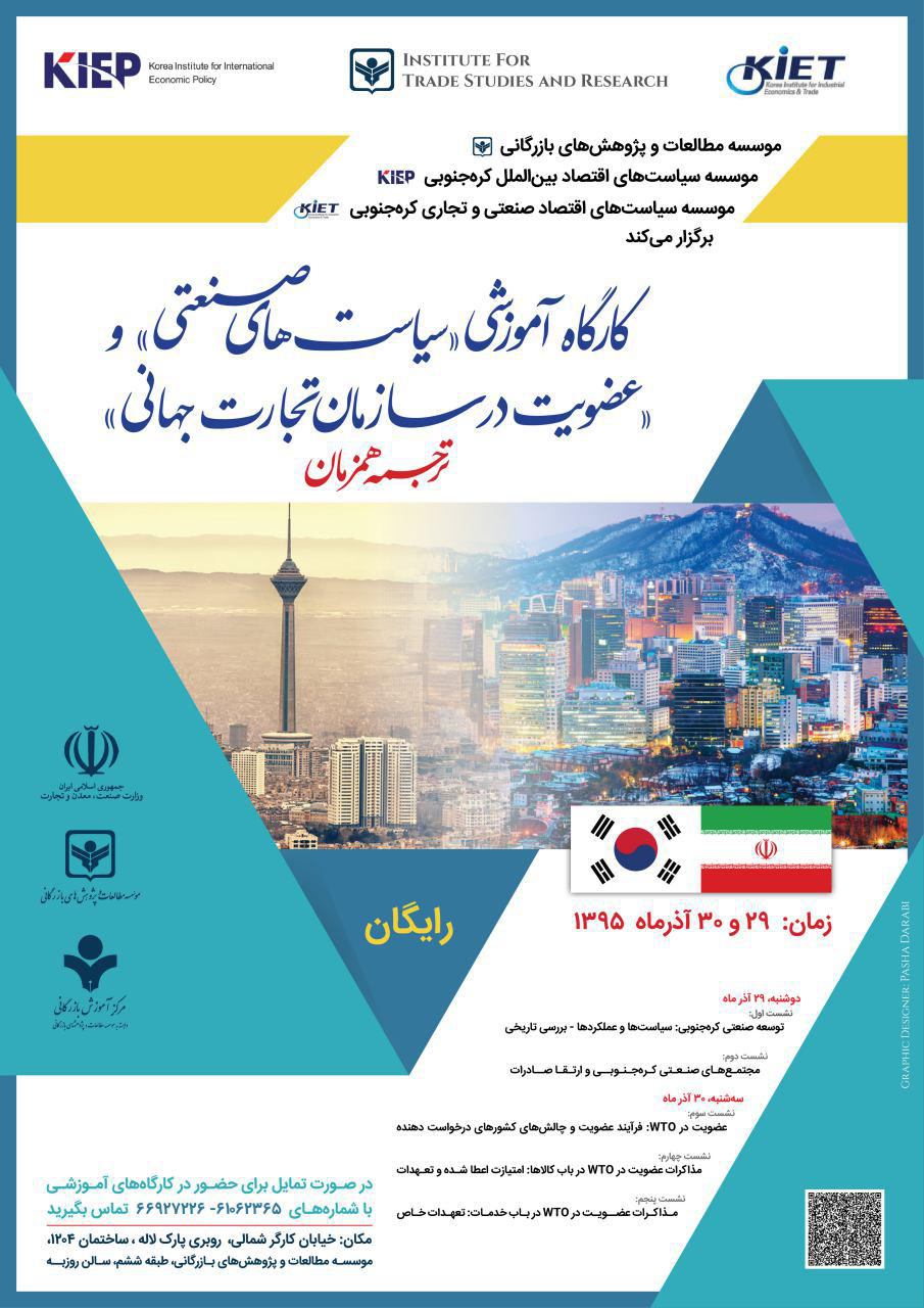 کارگاه آموزشی مشترک موسسه مطالعات و پژوهش های بازرگانی با موسسه اقتصاد بین الملل کره و موسسه اقتصاد صنعتی و تجاری کره، در روز دوم با برگزاری سه نشست در رابطه با مذاکرات عضویت در سازمان تجارت جهانی پایان یافت. در این نشست ها دکتر جون کیو سو و دکتر جونگ دوک کیم از موسسه اقتصاد بین الملل کره (KIEP) سخنرانی کرده و با متخصصان ایرانی به بحث و گفت و گو پرداختند.
