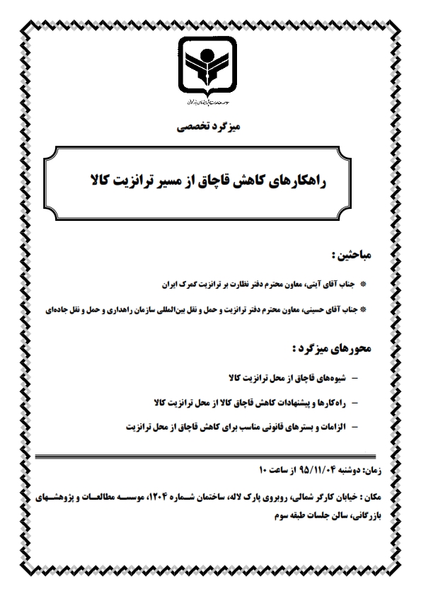 در میزگرد راهکارهای کاهش قاچاق از مسیر ترانزیت کالا که با حضور مصطفی آیتی معاون نظارت بر ترانزیت گمرک جمهوری اسلامی ایران و حسینی معاون ترانزیت و حملونقل بینالمللی سازمان راهداری و حملونقل جادهای به همت گروه بازرگانی خارجی موسسه مطالعات و پژوهشهای بازرگانی برگزار شد، ابعاد معضل قاچاق از محل ترانزیت و راهکارهای مرتبط با آن مورد بحث و بررسی قرار گرفت.