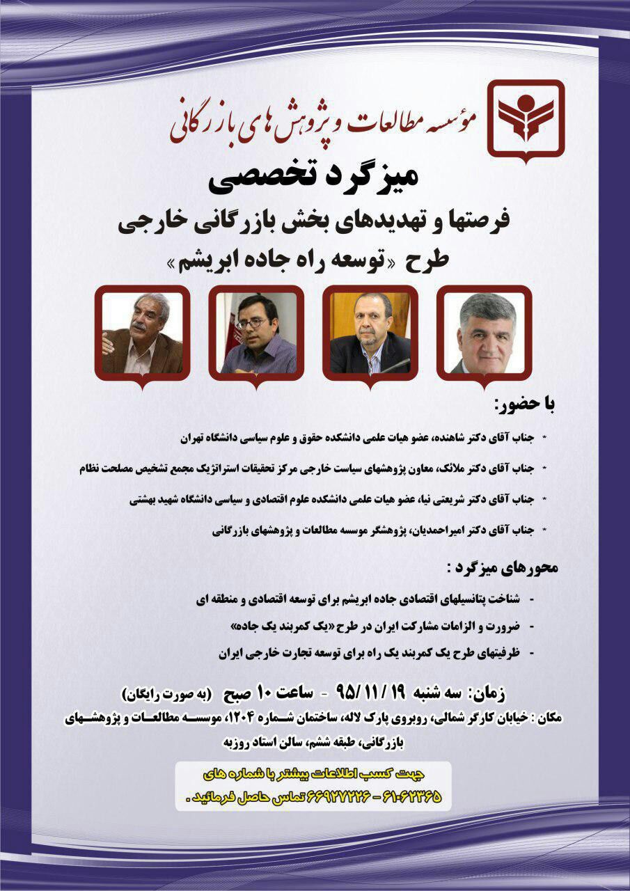 میزگرد تخصصی "فرصتها و تهدیدهای بخش بازرگانی خارجی طرح توسعه جاده ابریشم" به همت موسسه مطالعات و پژوهشهای بازرگانی و با همکاری دانشکده حقوق و علوم سیاسی دانشگاه تهران، دانشکده علوم اقتصادی و سیاسی دانشگاه شهید بهشتی و معاونت پژوهشهای سیاست خارجی مرکز تحقیقات استراتژیک مجمع تشخیص مصلحت نظام در محل موسسه برگزار شد.