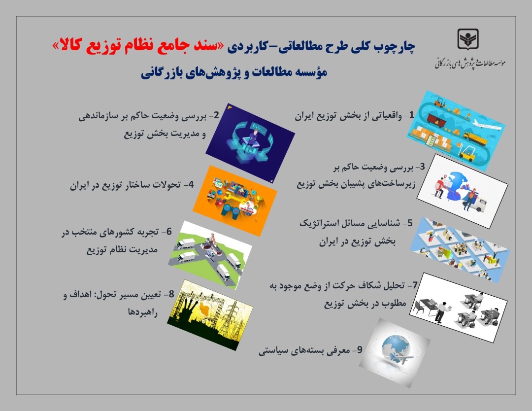 رئیس موسسه مطالعات و پژوهشهای بازرگانی اضافه کرد: این مطالعه کاربردی-اجرایی ابعاد وسیعی دارد که سرفصلهای آن شامل واقعیاتی از بخش توزیع ایران، بررسی ابعاد نظری سیاستگزاری در نظام توزیع، بررسی وضعیت حاکم بر سازماندهی و مدیریت بخش توزیع، بررسی وضعیت حاکم بر زیرساختهای پشتیبان بخش توزیع، تحولات ساختار توزیع در ایران، تجربه کشورهای منتخب در مدیریت نظام توزیع، شناسایی مسایل استراتژیک بخش توزیع در ایران، تحلیل شکاف حرکت از وضع موجود به مطلوب در بخش توزیع،تعیین مسیر تحول اهداف و راهبردها و معرفی بسته-های سیاستی میباشد.