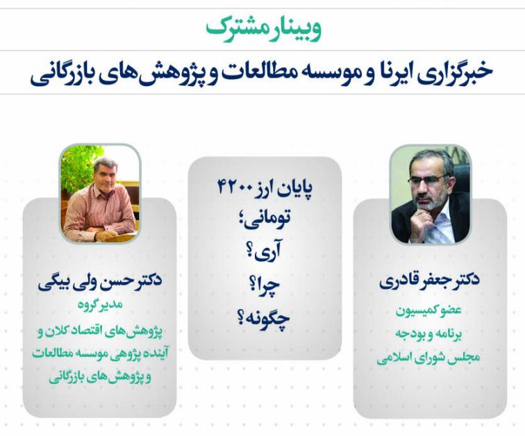 با هدف بررسی این موضوع، دفتر پژوهش و بررسیهای خبری خبرگزاری ایرنا با همکاری موسسه مطالعات و پژوهشهای بازرگانی، وبیناری با عنوان «پایان ارز ۴۲۰۰ تومانی؛ آری؟ چرا؟ چگونه؟» برگزار کرد و نظرات «دکتر جعفر قادری» عضو کمیسیون برنامه و بودجه مجلس و «دکتر حسن ولی بیگی» کارشناس مسائل اقتصادی را در این زمینه جویا شد.