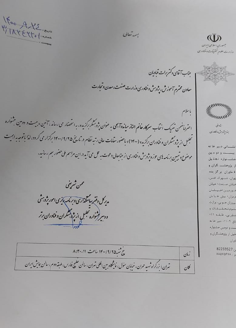 انتخاب الناز ميان دوآبچي به عنوان پژوهشگر برگزيده جشنواره پژوهشگران و فناوران