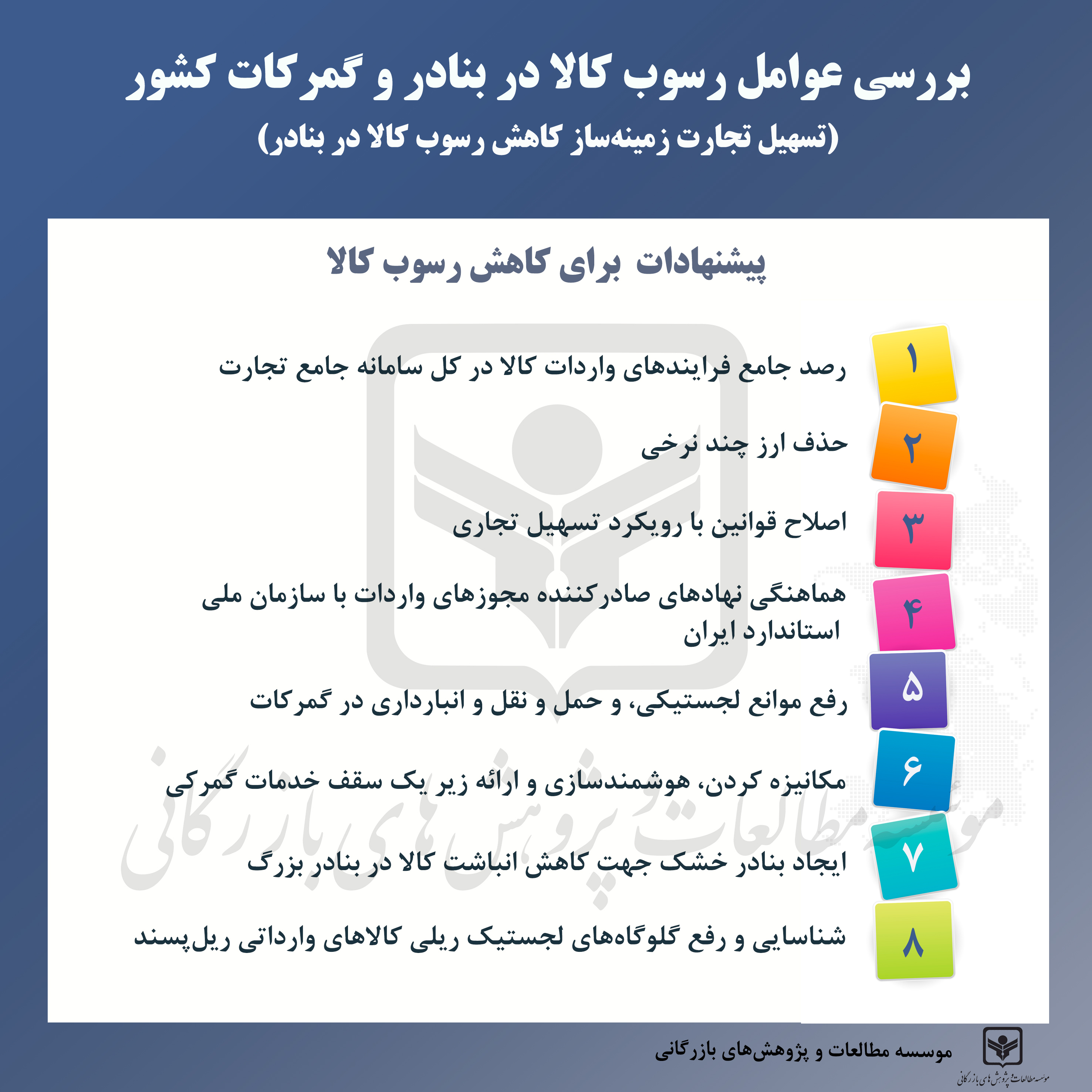 از مقایســه وضعیــت ایــران در شــاخصهای مرتبــط بــا فرآیندهــای تجــارت فرامــرزی و واردات کالا بــا کشــورهای مختلـف مشـخص میشـود کـه بـه طـور کلـی کارایـی ایـن فرآیندهـا (بـه خصـوص تشـریفات گمرکـی) در کشـورمان نیازمنــد بهبــود اســت. در ایــن راســتا، ضــروری اســت در کنــار اقدامــات جــاری کــه بــرای کاهــش رســوب کالا انجــام میشـود، اصلاحـات اساسـی در فرآیندهـای مزبـور بـا هـدف ایجـاد سـاختار نویـن در ایـن حـوزه صـورت گیـرد. بـرای ایـن منظـور مجموعـهای از پیشـنهادات بـرای کاهـش گلوگاههـا و ناکارآمدیهـای موجـود قابـل ارائـه هسـتند. ایـن راهکارهــا در ســه حــوزه ســاختارها و قوانیــن، حــوزه فرآیندهــا و حــوزه لجســتیک طبقهبنــدی شــدهاند.