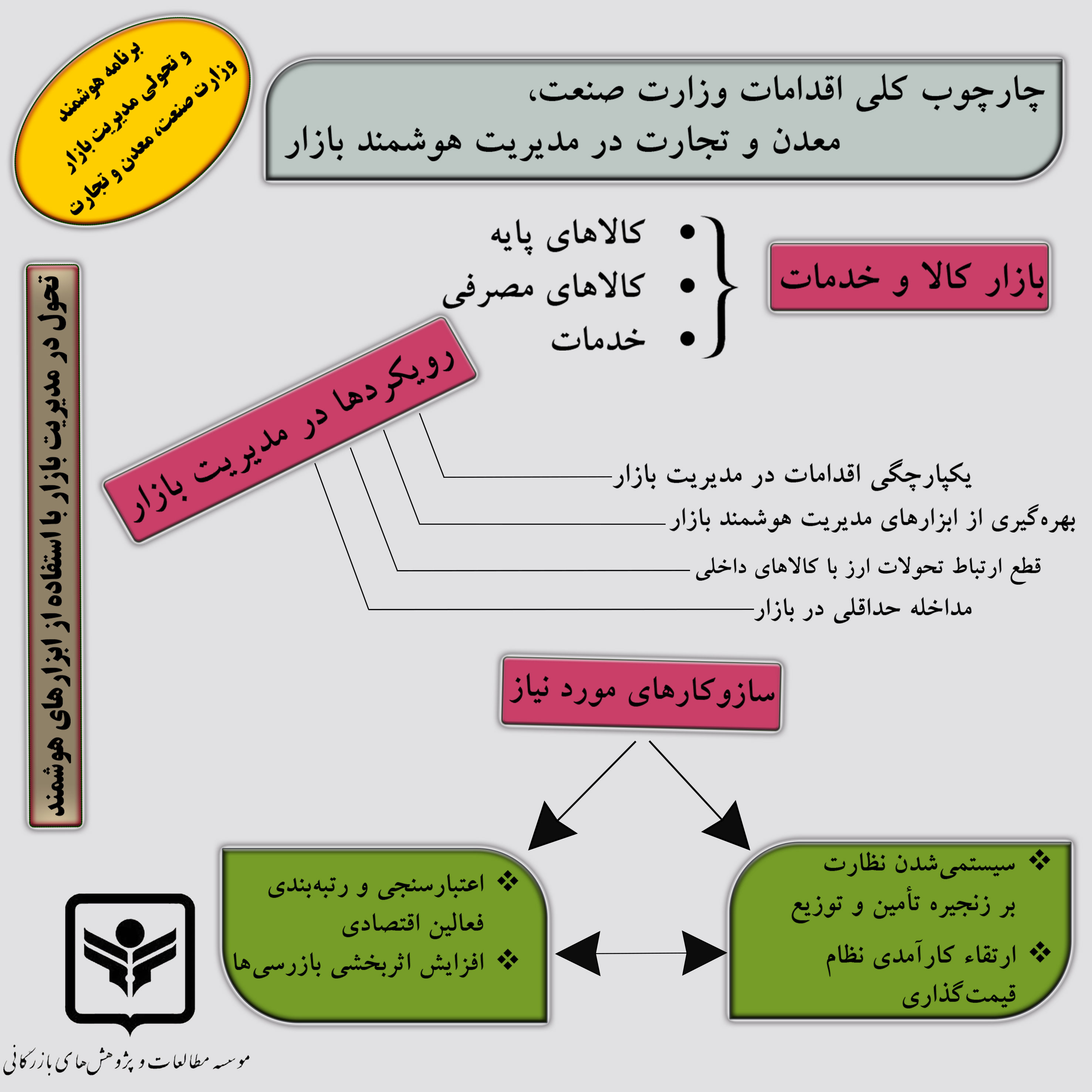 از آنجــا کــه اســتمرار مدیریــت بــازار بــا رویکردهــای ســنتی از کارایــی لازم برخــوردار نیســت، ضــروری اســت مدیریــت بــازار (بــا رویکردهــای تحولــی) به منظــور ایجــاد ثبــات در عرضــه و تقاضــا و قیمــت کالاهــا بــا ابزارهــای هوشــمند و خودتنظیـم مـد نظـر قـرار گیـرد. وزارت صنعـت، معـدن و تجـارت در برنامـه تحولـی مدیریـت بـازار کالاهـا و خدمـات به دنبـال مدیریـت هوشـمند بـازار از حلقـه اول یعنـی پیـش از تولیـد و تولیـد تـا حلقـه آخـر یعنـی توزیـع و مصـرف اسـت. در ایـن راسـتا مدیریـت بـازار بـا مداخـلات ضـروری و حداقلـی دولـت پیگیـری میشـود و ایـن رویکـرد در اصـلاح نظـام قیمت گـذاری و کنترل هـای پیشـینی و پسـینی دنبـال خواهـد شـد. در ایـن ارتبـاط، وزارتخانـه متبـوع بـا برخـورداری از برنامه هــای تحولــی بــرای گــذار از مدیریــت بــازار ســنتی بــه نویــن، اســتفاده از ابزارهــای خودتنظیــم و هوشــمند کـردن پایشهـا و نظارتهـا را به صـورت جـدی در دسـتور کار خـود قـرار داده اسـت.