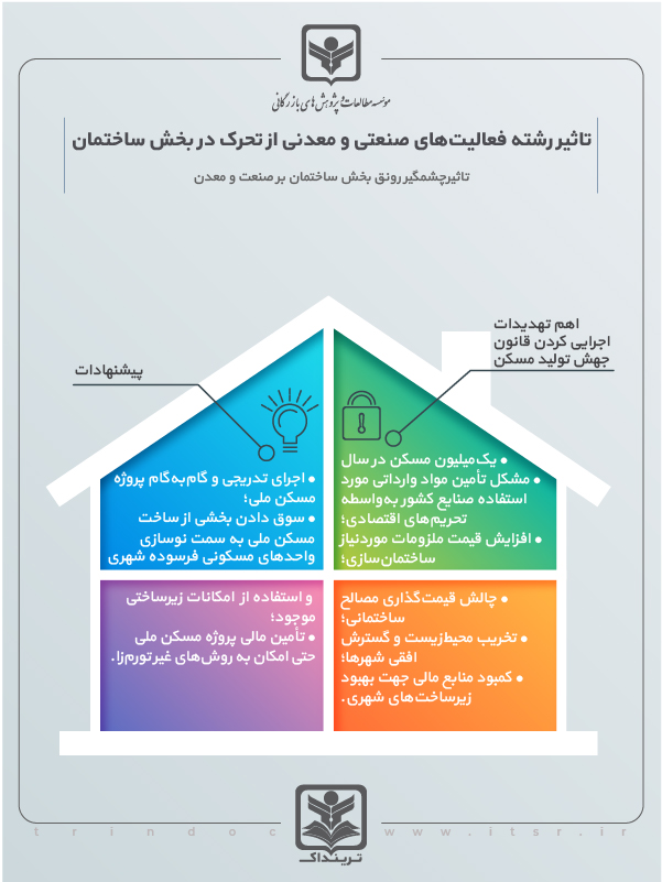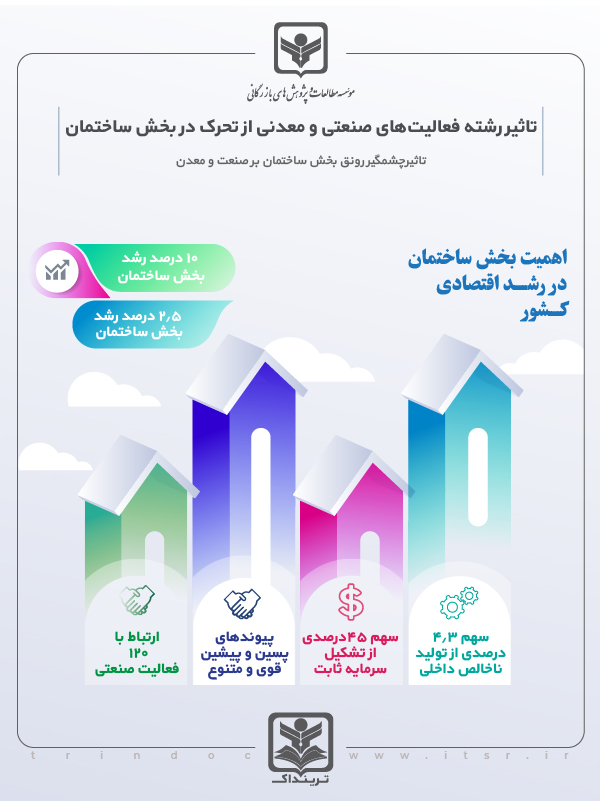 - بخش ساختمان با بیش از 120 رشته صنعتی ارتباط دارد بهگونهای که رونق و رکود این بخش تأثیرات مهمی بر عملکرد بخشهای صنعت و معدن دارد. تحریک تقاضای نهایی بخش ساختمان موجب افزایش تقاضا برای محصولات و تولیدات صنعتی و معدنی خواهد شد؛ و بالعکس کاهش فعالیتهای ساختمانی موجب کاهش تقاضا و رکود در سایر بخشها بهویژه بخشهای تولید و فعالیتهای صنعت و معدن میشود.