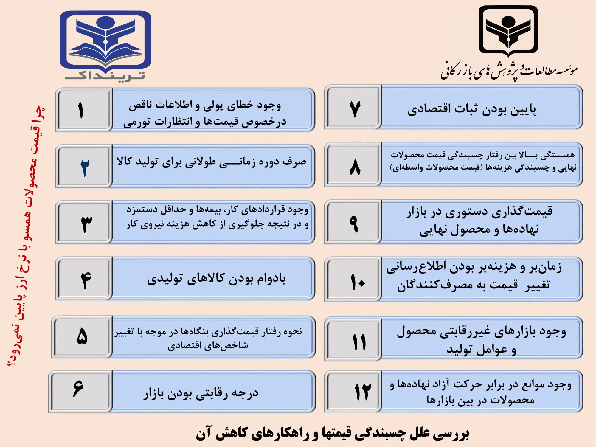 در چندماهه اخیر نیز علیرغم کاهش نرخ ارز بهعنوان یکی از عوامل مؤثر بر تورم در کشور، قیمتها در سطح بازار متناسب با آن واکنش نشان نداده است. موسسه مطالعات و پژوهشهای بازرگانی در گزارشی علل اصلی این چسبندگی قیمتها در بازار را ارائه کرده است: